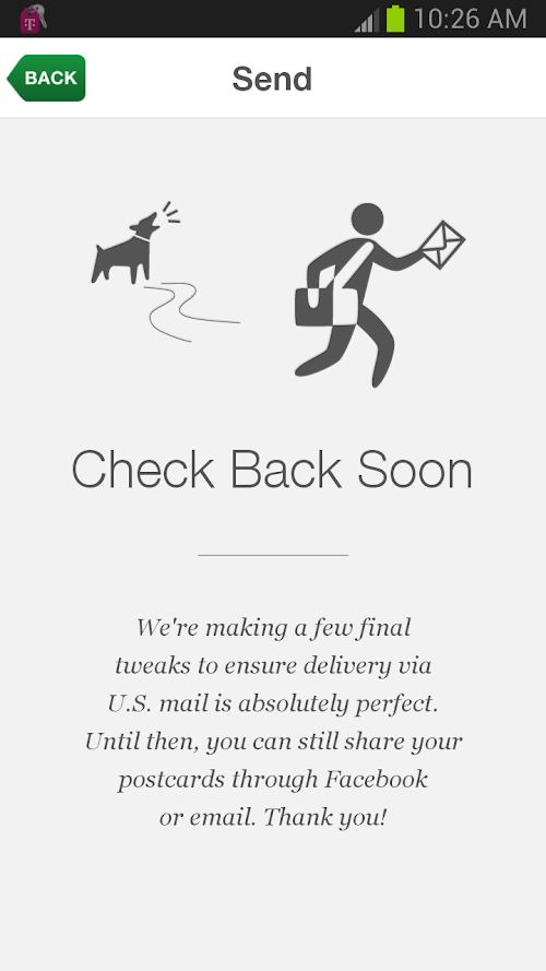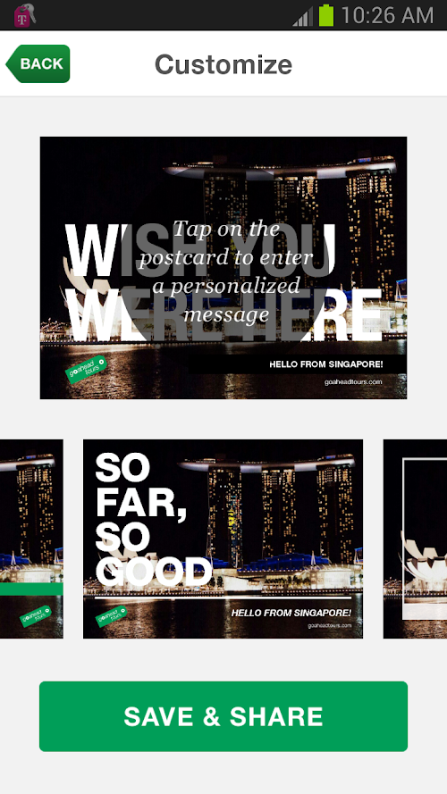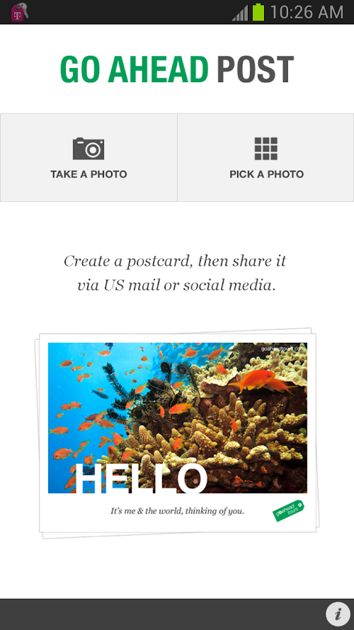 Go Ahead Post allows you to create and send a digital postcard from anywhere in the world. Just choose a photo from your camera roll (or take a new one) and customize it by adding a personal message. You can choose to send your postcard any way you’d like: via Facebook, email or both.