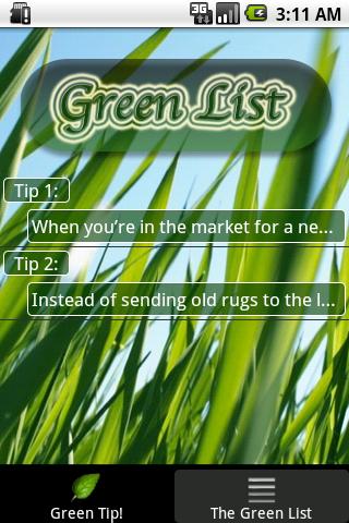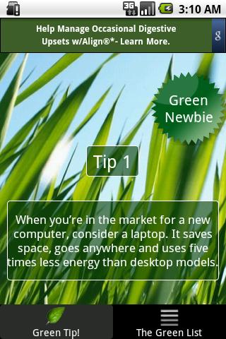 How green are you? Are you a part of the solution, or part of the problem? Get this app and get collectible green tips. You get a new green tip every time you reopen the app. Your "Green" status also updates as you earn more green tips.