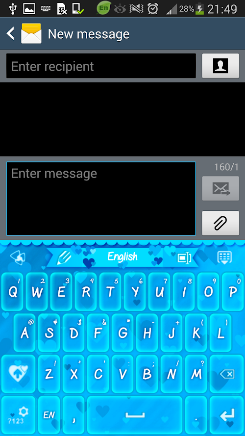 "GO Keyboard Blue Hearts Theme" is a pretty theme designed for girls who want to bring color to their plain keyboard for Valentine's Day. It has shiny blue buttons set on a blue wallpaper filled with different nuances of blue hearts and a cute glowing white font to match. This beautiful and cute theme is Inner Works Studios' gift to all the ladies who love and like being loved. We hope you enjoy Blue Hearts theme!