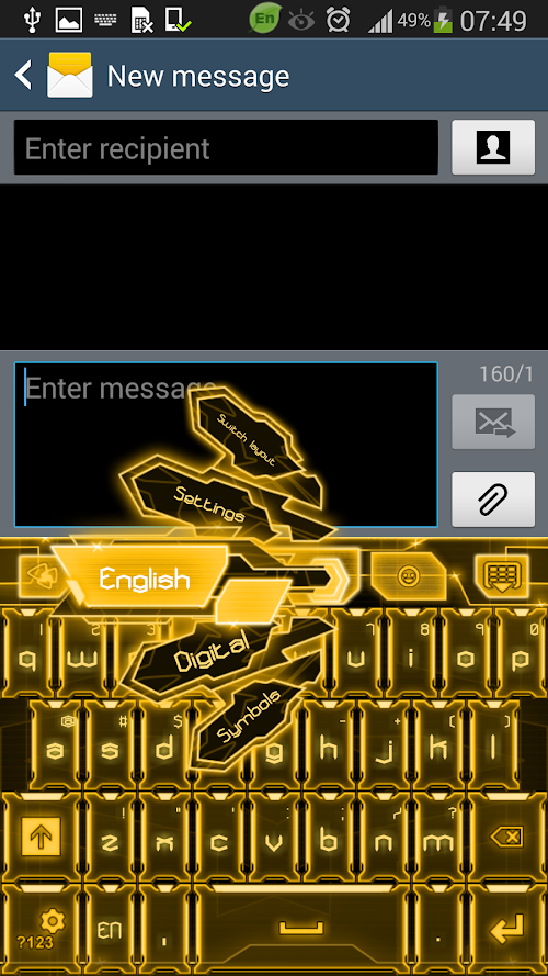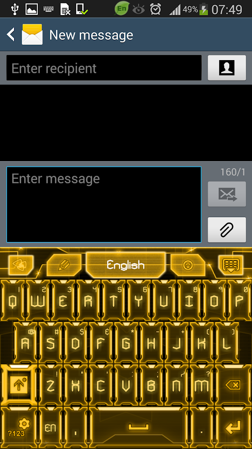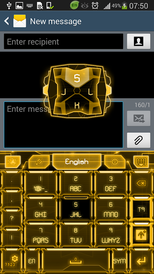 "GO Keyboard Gold Tech Theme" is a premium HD theme, designed by Inner Works Studios, for the sci-fi technology heads. The transparent keys have an amazing gold neon tech effect, they glow like a laser on a dark background, everything shines gold on a dark futuristic alien space ship design. The incredible high tech graphics will transform your keyboard with a unique stylish high-tech look. Enjoy our new free theme and feel free to check out the rest of our Tech series keyboards!