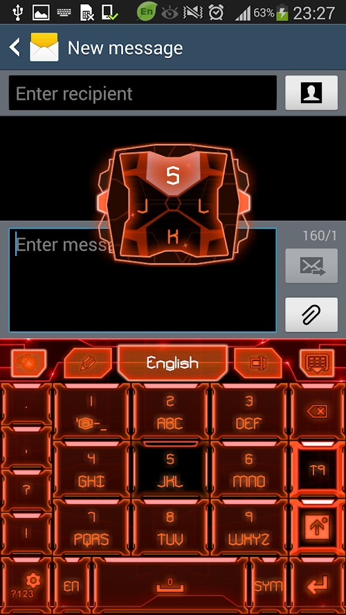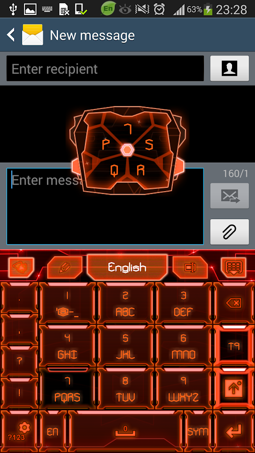 "GO Keyboard Orange Tech Theme" is a premium HD theme, designed by Inner Works Studios, for the sci-fi technology heads. The transparent keys have an amazing orange neon tech effect, they glow like a laser on a dark background, everything shines orange on a dark futuristic alien space ship design. The incredible high tech graphics will transform your keyboard with a unique stylish high-tech look. Enjoy our new free theme and feel free to check out the rest of our Tech series keyboards!