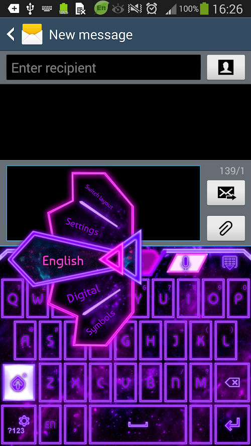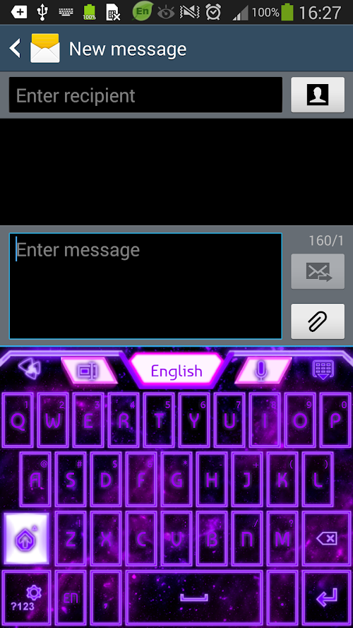 "GO Keyboard Purple Glow Theme" is an exciting sparkly theme designed by Inner Works Studios, with a combination of neon effect purple and pink semi transparent buttons that glow on a dark galaxy sky background, filled with purple and pink stars. The theme's bright colors have a techno neon laser effect and make your phone vivid and really electric. So if you want your keyboard to glow like a neon customize your smartphone with "GO Keyboard Purple Glow Theme" and transform your plain black phone with a cool pop of color! We hope you enjoy our free theme and feel free to check out the rest of our Glow series keyboards!