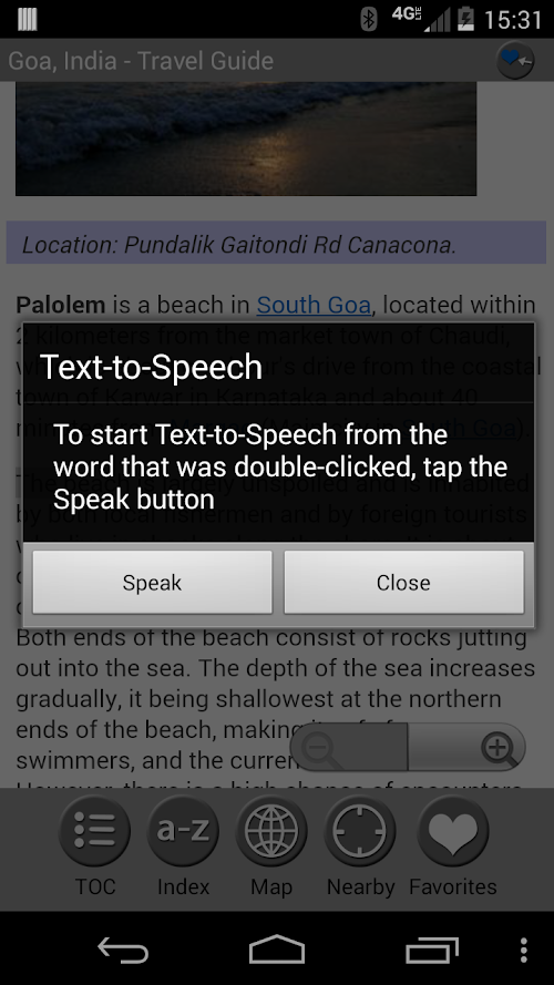 This fully-functional guide is absolutely free. The full version (only $4.99) adds Text-To-Speech and expands articles with more information about attractions, history, culture, itineraries, phrasebooks and more. Listen to complete articles on the go with Text-To-Speech: double-tap on a word to start Text-To-Speech from the selected word or select Menu > Start Text-To-Speech.