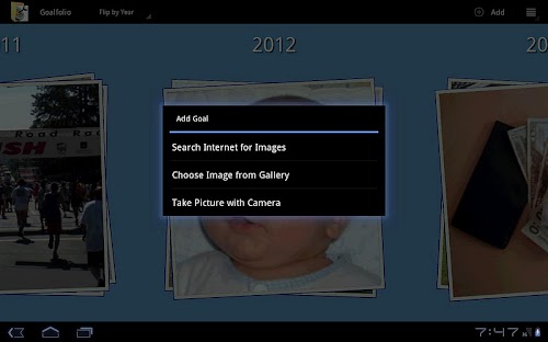 Put this powerful principle to work right now by visualizing your goals with the help of Goalfolio. Select images for each of your goals and assign them to the year you want to complete them. Add goals by taking pictures, browsing your photo gallery, or searching the internet. Flip through your goals, browse and organize with ease. It’s your portfolio of goals, review them and think about them daily. See your success and make it happen!