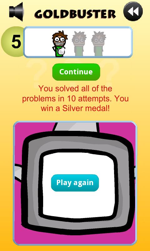 When you play Goldbuster the goal is to answer different kinds of math problems correctly. Each time you complete a set of problems, you get to see a short, fun animation. If you answer all of the problems correctly, you win a gold medal.
