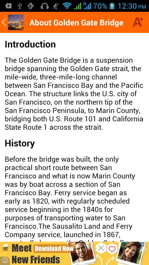 Monuments are the pride of the country they belong to. This Golden Gate Bridge app will provide you all the details about the famous monument. The Golden Gate Bridge is situated between San Francisco Bay and the Pacific Ocean and is a suspension bridge spanning the Golden Gate strait, the mile-wide, three-mile-long channel. The Frommers travel guide considers the Golden Gate Bridge "possibly the most beautiful, certainly the most photographed, bridge in the world".