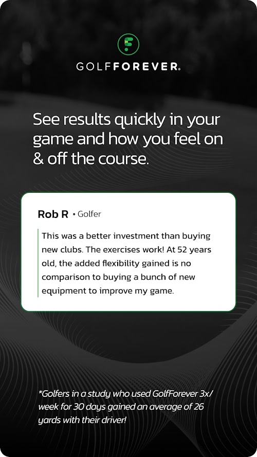 GOLFFOREVER is the #1 SMART at-home golf training app - used by multiple top 40 PGA and LPGA pros including 2022 Masters winner Scottie Scheffler -to maximize clubhead speed, core strength, flexibility, and range of motion through our proprietary, personalized golf-exercise plan. Designed by top tour trainers and doctors to improve your body, relieve pain and avoid injuries with golf-focused fitness, GOLFFOREVER is a top-rated app that gives members lower scores and pain-free living on and off the golf course.