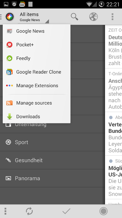 Google Reader was the most popular service for reading feeds. This extension allows you to use services that has the same API as Google Reader. It requires News+ to work with.