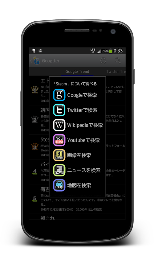 If you'd like to know the keyword meaning, you can get the meaning, origin and etc... in Wikipedia searching result by just one click. in case of Twitter tweets, you can jump to original Twitter tweets.