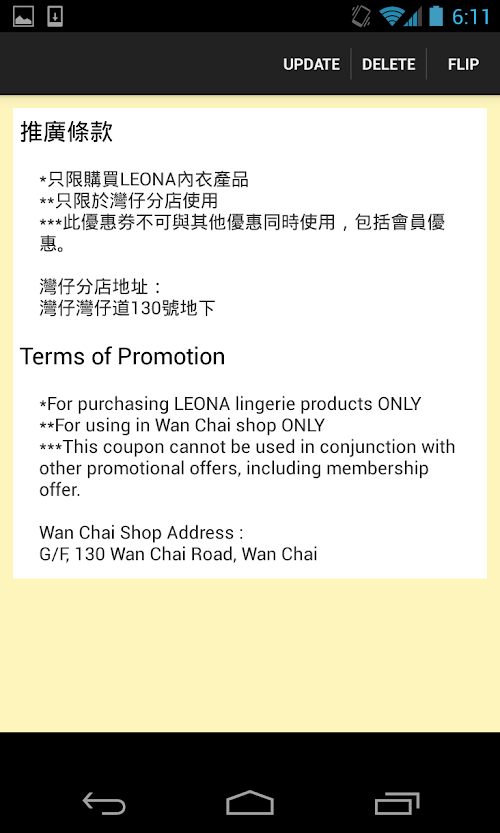 Notification on lock screen when near the location (set on the pass by retailers), which reminding you the news, promotions or to use the scanned coupons. More opportunity to enjoy offers before expiration date.