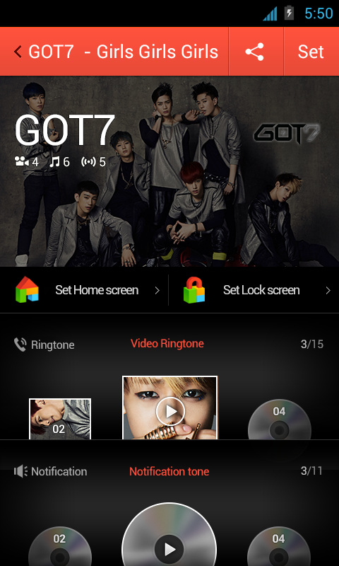 ▶ Launch dodop pop and select “Package” menu, or touch the icon of downloaded package app and set video ringtone & SMS/ notification sound!