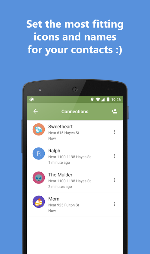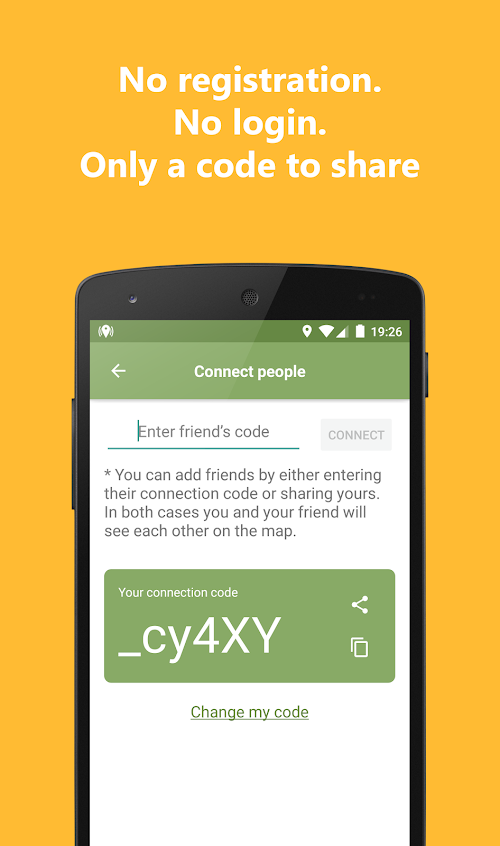 - Quick connection setup: enter your friend's "connection code" and that's all, you can see each other's locations