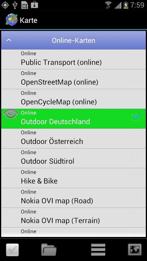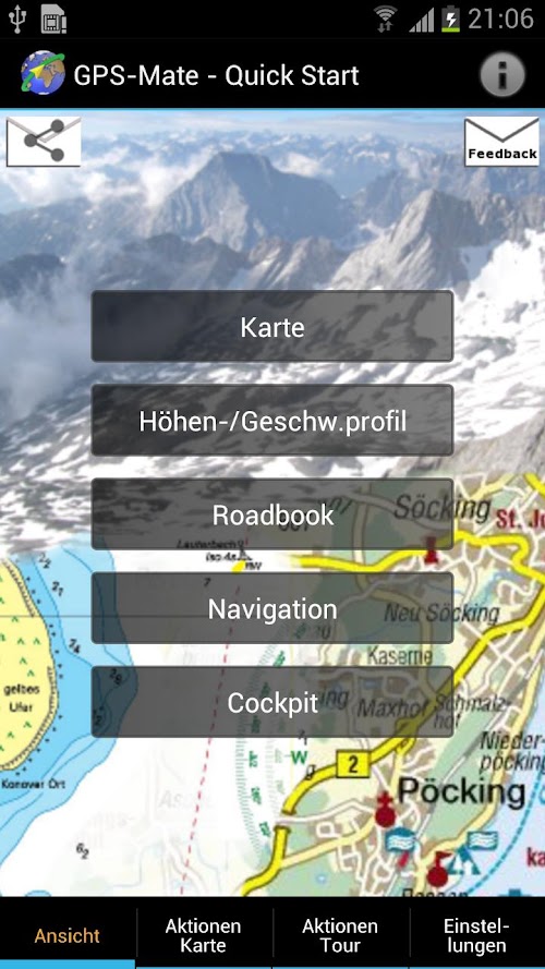 Use online, topographic and scanned maps, aerial and sat photos. Save own maps for use without network. Navigate and manage tours (GPX,KML,LOC), record own tracks and Point-Of-Interests and plan new tours.
