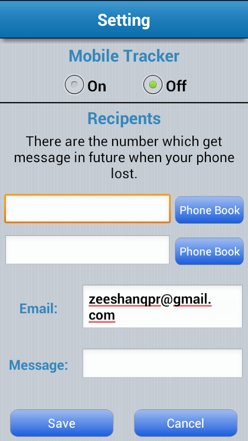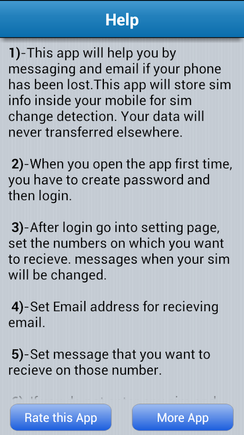 3) Be Careful when changing SIMyourself because when sim is changed then this app will sends SMS and email to your store number and email account after every 15 minutes to track your mobile. When you want to change SIM, first go into app and turn off tracker.
