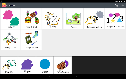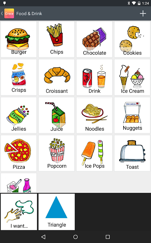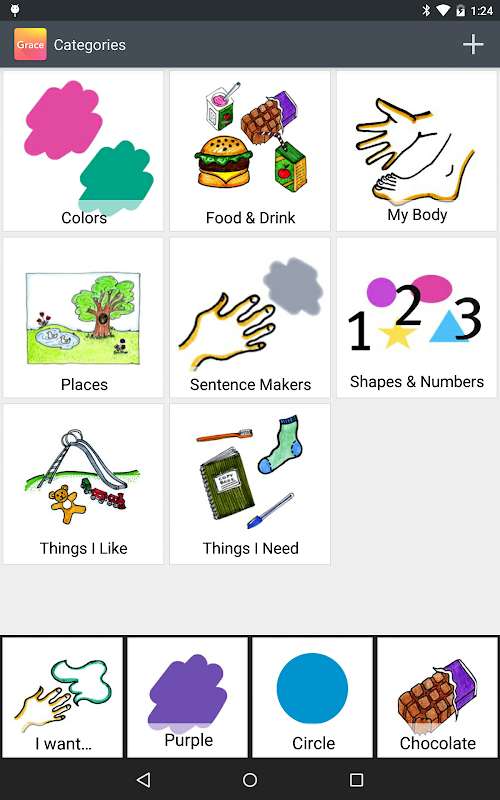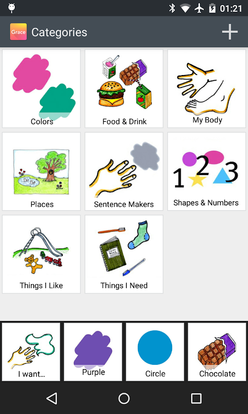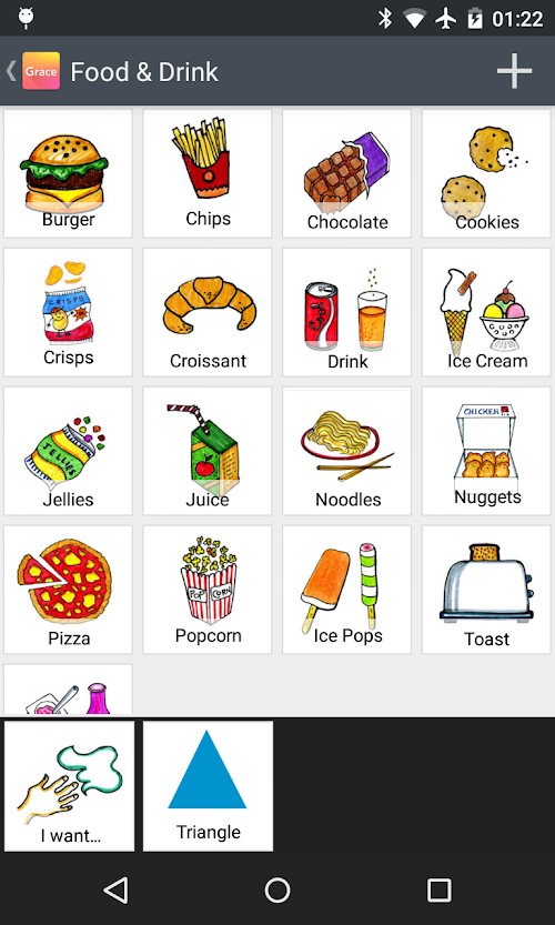 Grace comes with a basic vocabulary of pictures, but it can be fully customized using the device camera, stored photographs or images saved from the internet and added to your device album. Users can select pictures to form a semantic sentence which they can then share, by tilting the device to create a full-screen view, and pointing at each card to hear the listener read each word.