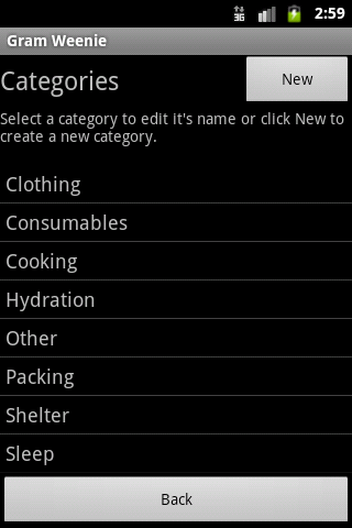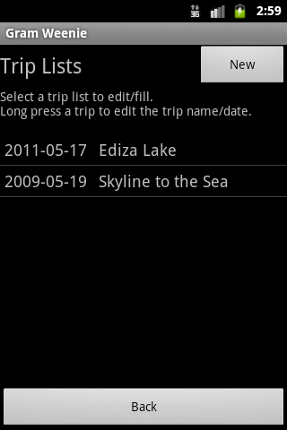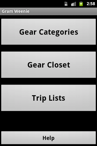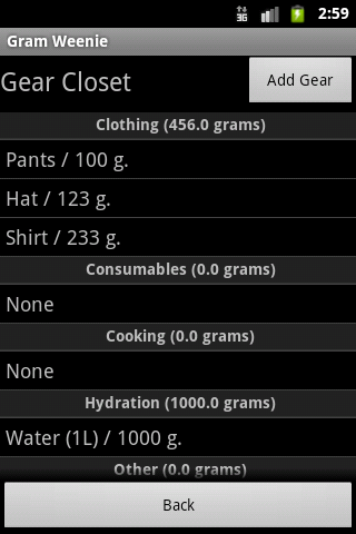 Gram Weenie is a tool to track and calculate your Full Skin Out weight for your backpacking gear. The main screen is your master list of gear and you can create trip lists to customize and calculate your gear weight for each trip.