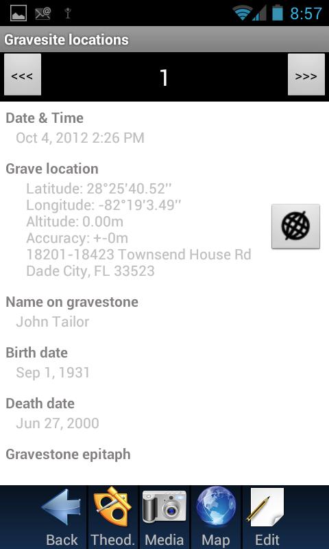 When an event is created it automatically documents the longitude, latitude, altitude (or you can mark the grave on a map for precise locations) time, and date with instant access to the smartphone camera, audio recorder, notes, and a theodolite (for calculating distances to or elevation of objects).