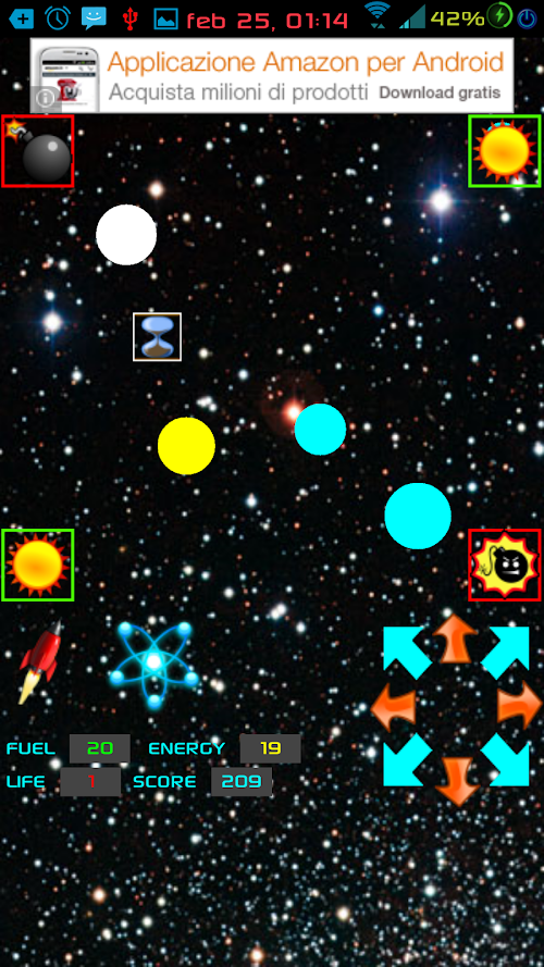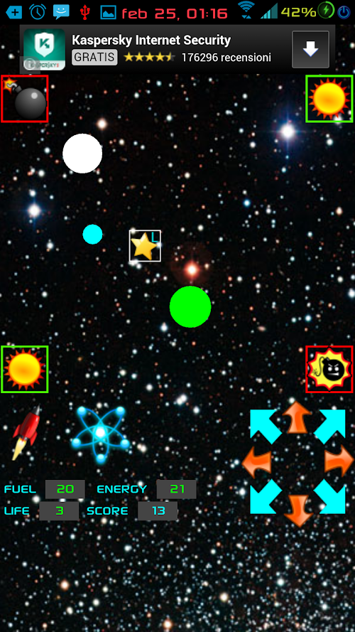 Gravitational BALL there are 2 units: a spaceship, piloted with 8 directional keys, that will allow you to collect bonuses and accumulate energy in a capsule-tank. This can only be moved by gravitational force, then properly orienting the smartphone. However, you can use the key BOOSTER [rocket] that will give a short acceleration to the capsule-tank, or the TELEPORT [atom] that instead a random teleport. Both of these actions, however, consume fuel, so must be used with care. The gravitational-tank is very delicate: any collision resulting in a damage and loss of energy, except with your spaceship [ignored] and with the sun-squares in the north-east and south-west corners, whose contact produces +1 power, and teleport capsule in the central area of the game.