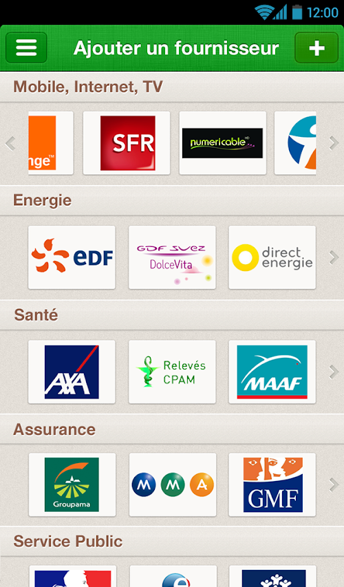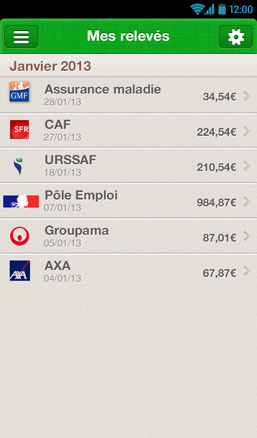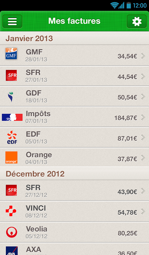 Greenbureau recovered class and automatically archive invoices and records of all your suppliers (EDF, GDF, Orange, SFR, Axa, MMA, etc..) And utilities (Taxes, Insurance, CAF, etc..).