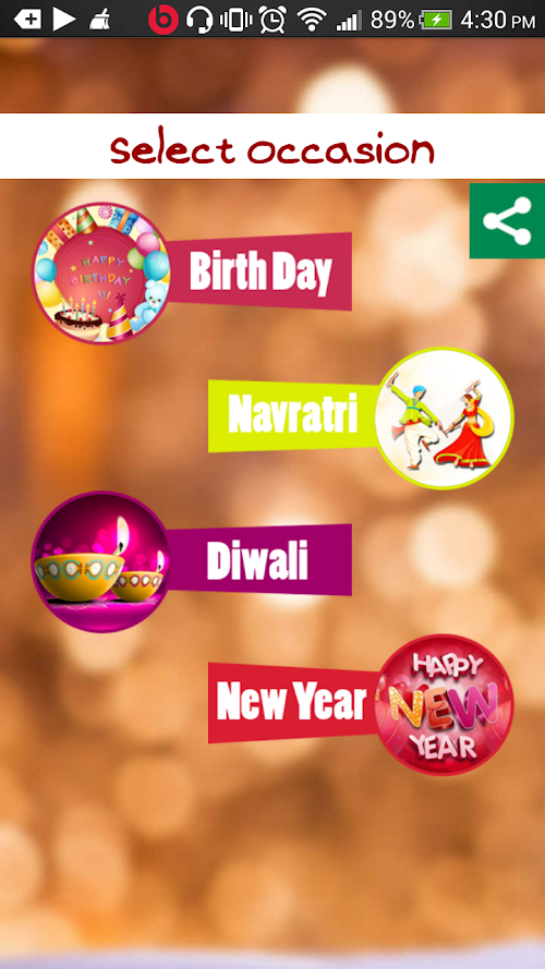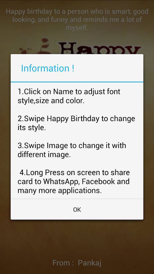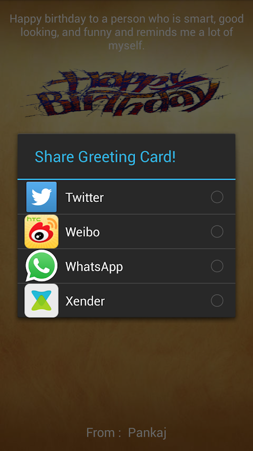 9.All done, now just long press on screen and dialog will be opened, from there you can share your customized greeting card.
