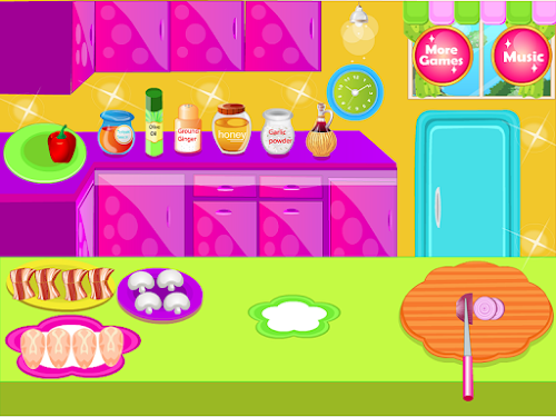1) At the beginning of the game you will get that our kitchen is a small kitchen but you will find everything that you need. You will need: to cut onion, to cut a red pepper, to cut mushrooms and then all the vegetables that you've cut you have to enter them in a plastic bag. Over these you have to enter the slices of bacon and chicken pieces. Over all the ingredients in the bag you must add: paprika red, honey, grated ginger and granulated garlic. Packets with spicy ingredients will have to enter in the refrigerator;