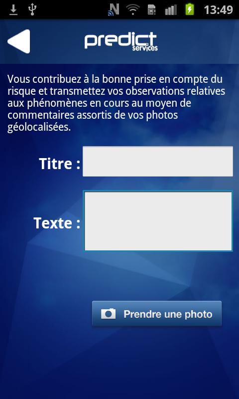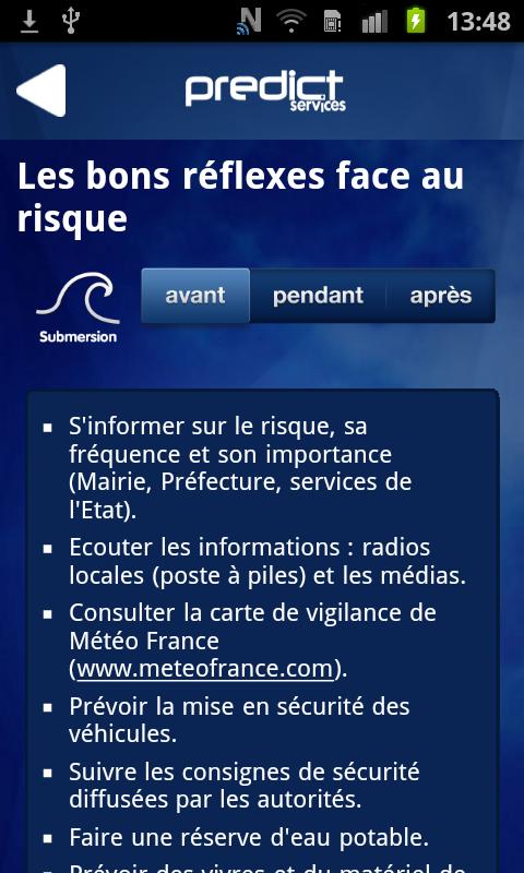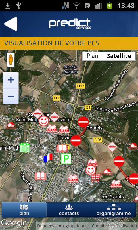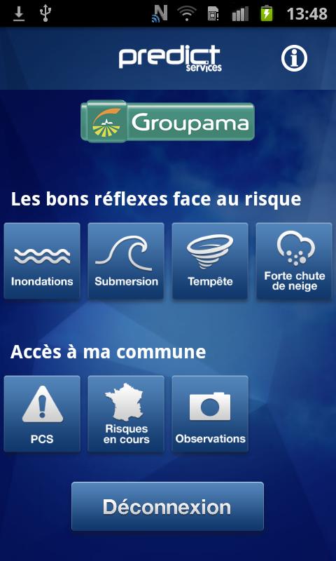 Ils disposent ainsi du temps nécessaire pour activer leur plan communal de sauvegarde pour la mise en sécurité de leur collectivité et de ses habitants. Ils peuvent y consulter leur plan synthétique d’action face à ces risques et partager leurs observations de terrain par l’envoi de photos commentées et géolocalisées sur la situation.Groupama-Predict is an application for mayors and local risk managers to help them in their mission to safeguard the territories and their citizens face to hydrometeorological hazards.
