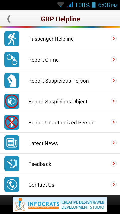 GRP mobile application also provides a direct platform to Indian Railway passengers to communicate with the railway police authority regarding their complaints, inconvenience, suggestions and feedback.