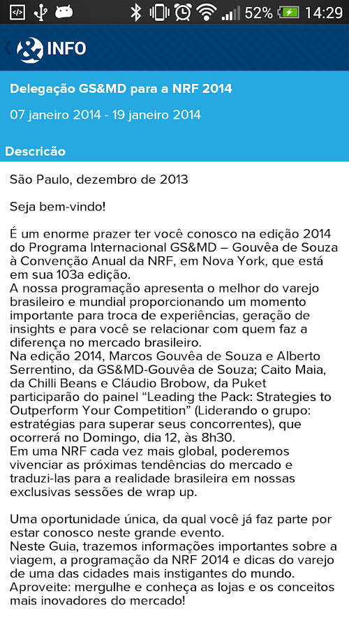 Aplicativo que reúne informações completas sobre os eventos nacionais e internacionais realizados pela GS&MD Gouvea de Souza. São mais de 25 anos realizando eventos especializados em varejo.Comprehensive application that gathers information on national and international events held by GS & MD Gouvea de Souza. Are over 25 years performing specialized events in retail.