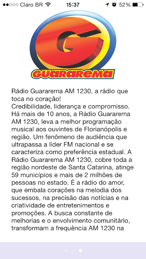 Credibilidade, liderança e compromisso. Há mais de 10 anos, a Rádio Guararema AM 1230, leva a melhor programação musical aos ouvintes de Florianópolis e região. Um fenômeno de audiência que ultrapassa a líder FM nacional e se caracteriza como preferência estadual. A Rádio Guararema AM 1230, cobre toda a região nordeste de Santa Catarina, atinge 59 municípios e mais de 2 milhões de pessoas no estado. É a rádio do amor, que embala corações na melodia dos sucessos, na precisão das notícias e na criatividade de entretenimentos e promoções. A busca constante de melhorias e o envolvimento comunitário, transformam a frequência AM 1230 na mais sintonizada todos os dias, nos lares catarinenses. Aqui tem sempre alguém pensando em você! Credibility, leadership and commitment. For over 10 years, Guararema Radio AM 1230, carries the best music programming to listeners and Florianópolis region. A phenomenon of hearing that exceeds the national leader and FM is characterized as a state preference. The Guararema Radio AM 1230, covers the entire northeast region of Santa Catarina, reaches 59 counties and more than 2 million people in the state. It is the radio of love, hearts cradling the melody of hits on the accuracy of the news and the creativity of entertainment and promotions. The constant search for improvements and community involvement, transform the 1230 AM frequency in more tuned every day, in Santa Catarina homes. Here is always someone thinking about you!