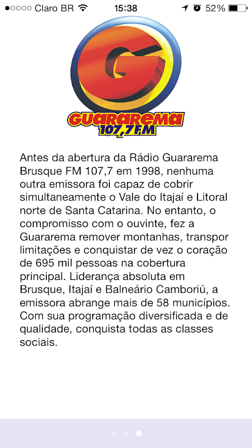 Antes da abertura da Rádio Guararema Brusque FM 107,7 em 1998, nenhuma outra emissora foi capaz de cobrir simultaneamente o Vale do Itajaí e Litoral norte de Santa Catarina. No entanto, o compromisso com o ouvinte, fez a Guararema remover montanhas, transpor limitações e conquistar de vez o coração de 695 mil pessoas na cobertura principal. Liderança absoluta em Brusque, Itajaí e Balneário Camboriú, a emissora abrange mais de 58 municípios. Com sua programação diversificada e de qualidade, conquista todas as classes sociais. Before the opening of Radio Guararema Brusque FM 107.7 in 1998, no other broadcaster was able to simultaneously cover the Itajai Valley and North Coast of Santa Catarina. However, the commitment to the listener, made Guararema remove mountains, conquer and overcome limitations of time the heart of 695 000 people in the main cover. Absolute leadership in Brusque, Balneario Camboriu and Itajai, the network covers more than 58 counties. With its diverse and quality programming, conquer all social classes.
