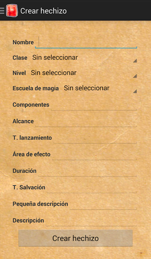 Esta aplicación permite la creación de nuevos hechizos o conjuros que quedarán guardados para consultarlos en cualquier momento durante tus partidas.