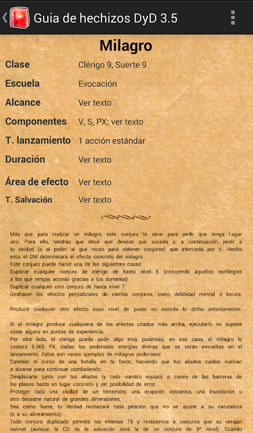 ¡¡Déjales el manual para ellos!!, porque con esta aplicación no necesitarás echar mano de él para ver los detalles de todo tu arsenal de hechizos, ya que esta guía de hechizos D&D 3.5 es una aplicación de referencia para todo jugador de Dungeons & Dragóns edición 3.5, por todos los hechizos y conjuros que contiene de esta edición.