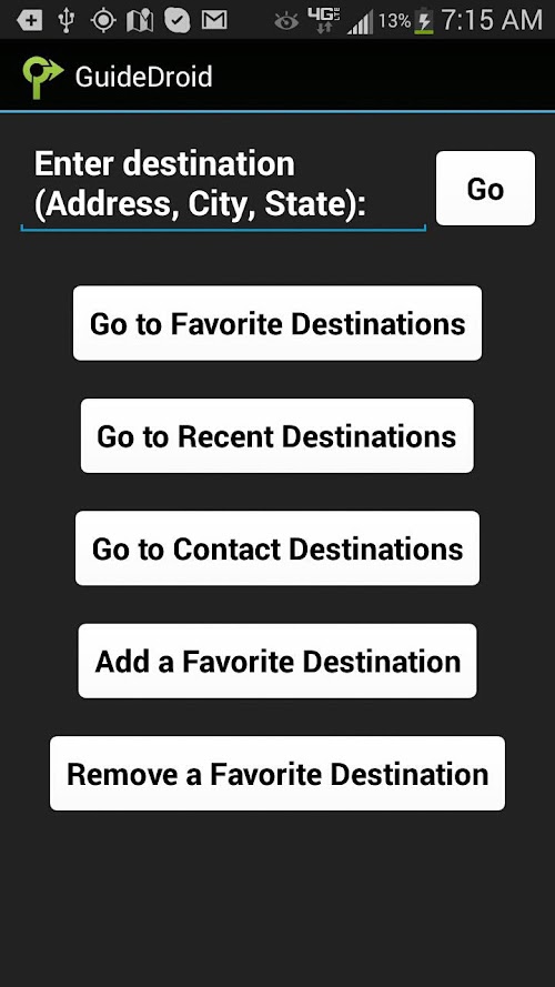 Once a destination address is entered, GuideDroid® can provide walking, biking, driving, and transit directions. When used for walking directions, GuideDroid® shows users where they are as they walk, and continually announces street addresses near their current walking location. GuideDroid® can automatically navigate users to the location of an address book contact, assuming that the contact profile includes address information.