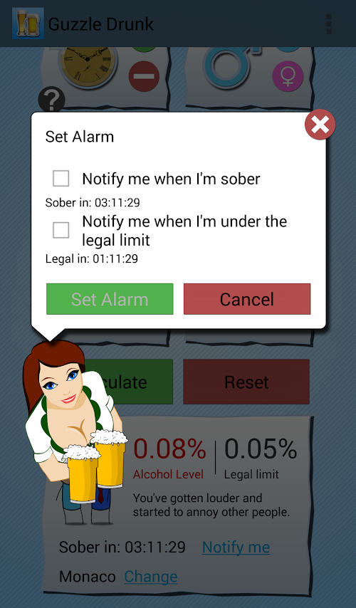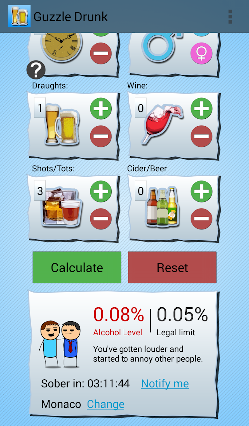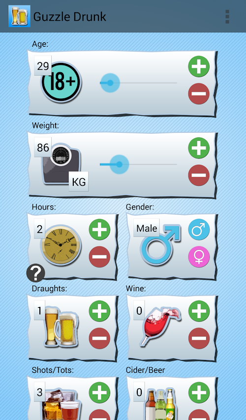Extremely simple and accurate, Guzzle Drunk is a sophisticated blood alcohol calculator that estimates your blood alcohol level based on what you have had to drink, your age, weight, gender and when you started drinking.