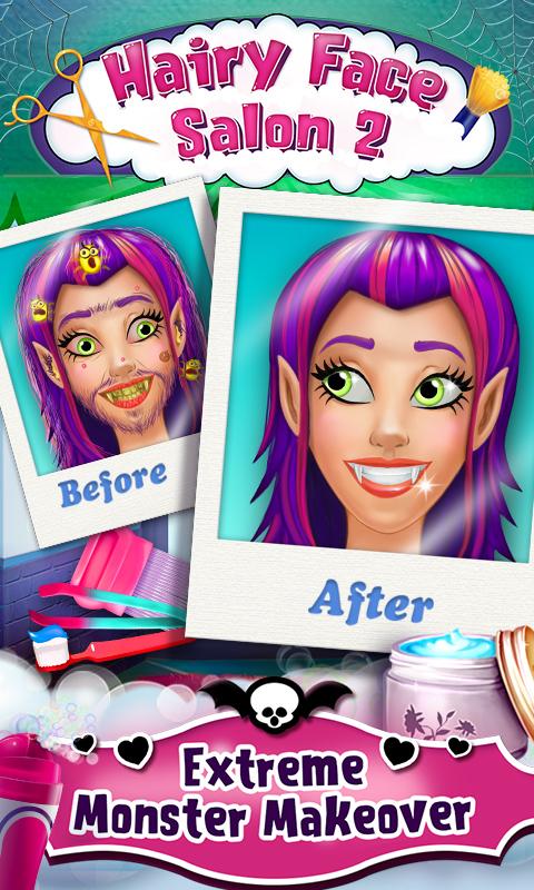 Welcome back to the Hairy Face Salon! The most fashionable and fun monster salon on the Google app store! These adorable monsters need a scary cool makeover for their first day of high school! Can you help style them?! Run your own salon! Shave, tweeze, wax and pick lice from your monsters’ hair!