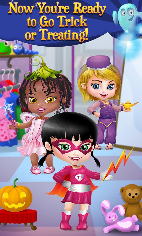 In order to try on a costume, you need to look the part first! Stop by the spa / salon for a Halloween makeover and take all the time you need to pamper yourself and maybe even look a little spooky for the party! Start with a hairbrush and tweezers, and then you can wash and blow dry your hair like a real salon! Don’t forget to brush her teeth with the spooky toothbrushes! In this app, your makeup and beauty tools are even customized for Halloween! Decorate yourself in pumpkin themed face cream, or a bat eye mask, even a spooky makeup remover!