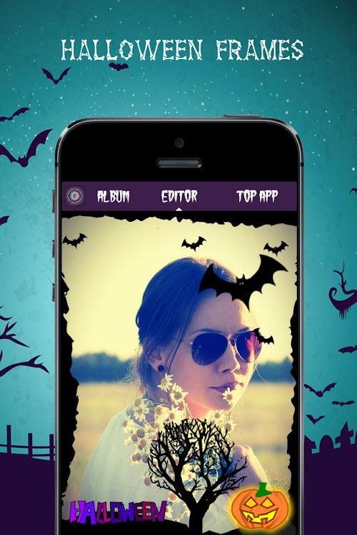* Haunted Frames about: Bat, Pumpkin, Dark moon, Witch, Haunted House.