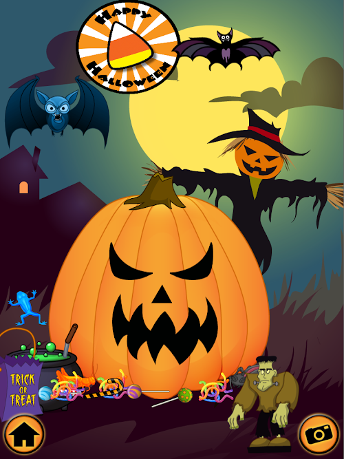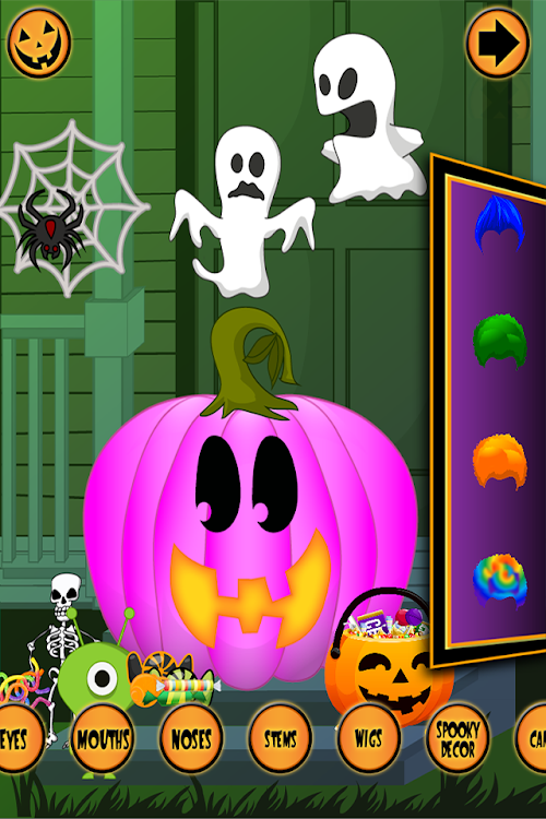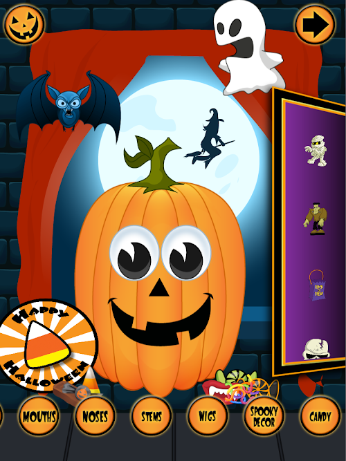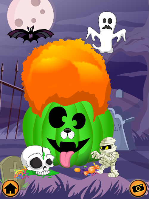Make spooky Pumpkin creations and express your Ghoulish side. Create endless Halloween scenes with 7 Backgrounds, variety of Pumpkin shapes, scary Faces, glowing Mouths, funny Noses, Glasses, Stems, Wigs, Candy and Spooky Décor. All Treats, no Tricks!