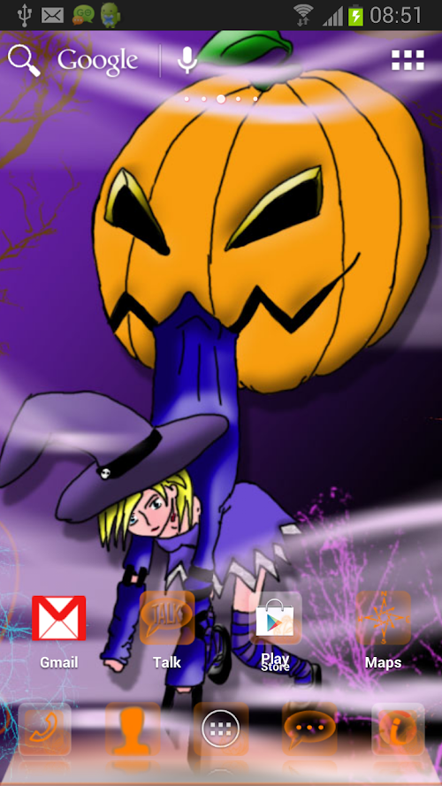 Application for launcher for halloween. Halloween Day is soon so now download our app for free. Wallpaper is a witch caught in the teeth of bad pumpkin.Background main application menu is also a large pumpkin with a witch. Each icon has an orange background and a transparent tile. The application is fun and terrifying at the same time as the real Halloween. Major icons have been replaced with orange. If you like this application also see our other products with this or a similar subject.
