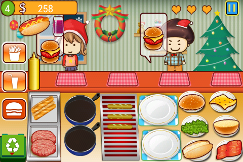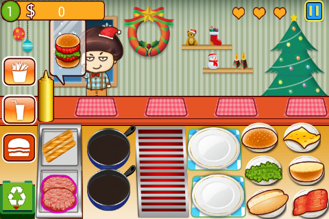 actual environment of a restaurant. Customers come in when there are vacant seats and place order for different kinds of dishes. You must react quickly to meet different orders from your from your customers. As you are the master chef in this cafe, you need to prepare all the food from top to buttom including hamburger, hot dog, beverages, french fries .... in time to satisfy your customers,