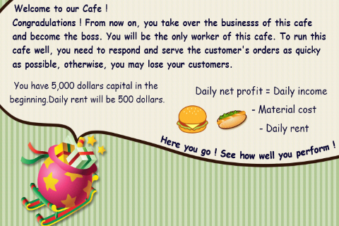 You'll be given $5,000 dollars in the beginning as capital, besides the material cost, you need to pay the daily rent as well. See how well you achieve. Don't let your cafe be in red.