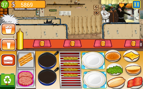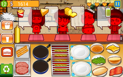 This is an very interesting restaurant game which simulates the actual environment of a restaurant. Customers come in when there are vacant seats and place order for different kinds of food and beverages. You must react quickly to meet different orders from customers. As you are the master chef in this cafe, you need to prepare all the food from top to buttom including hamburger, hot dog, beverages, french fries .... in time to satisfy your customers, otherwise, they will be annoying and impatient with your slow action and even leave the restaurant right away. Manage your time well to avoid over-done of the food, your revenue will be deducted for wastage of raw materials.