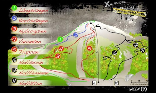 Denna ledkarta görs av X-guides, ett projekt för dig som gillar extrem-/äventyrssporter. X-guides är tydliga guider med kartor, bilder och filmer som hjälper dig hitta rätt, hitta guldkornen samt avgöra vad som är på din nivå. Vi vill också inspirera till äventyr på nya och oväntade platser. X-guides har som mål att komma ut med många nya led-/pistkartor och guider för offpiståkning, klättring, cykling, surfing m.m.Welcome to the interactive ledkarta for Hammarbybacken DH biking.