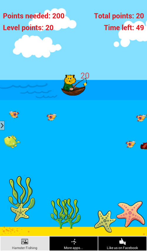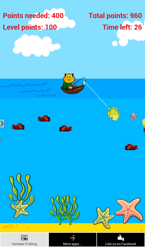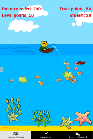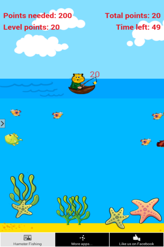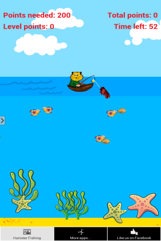 Ready, set, go! With "Hamster Fishing" the fun never ends. Catch as many as you can, with over 7 different kinds of fishes to choose from. Catch a shoe and even score points. Reel in as many as you can, with a multi level challenge, from novice to expert, the fishing fun with "Hamster Fishing" goes on and on. They say "Give a hamster a fish, and he will eat for a day; teach a hamster to fish and he will fish so much that there won't be any fish left in the sea." This app is highly addicting and, user discretion is advised.