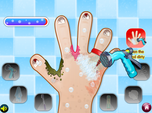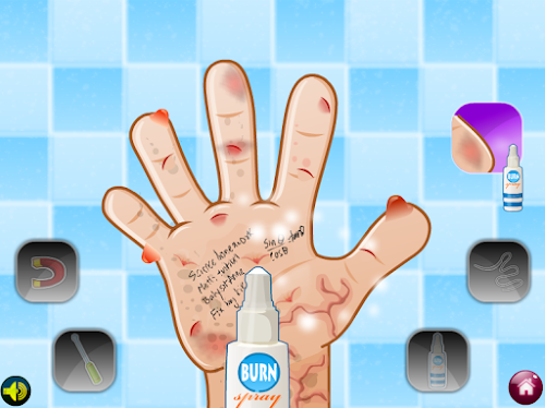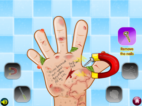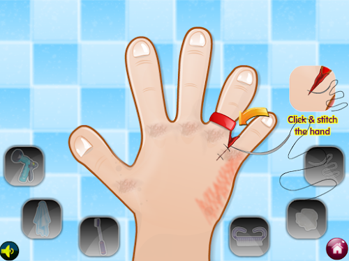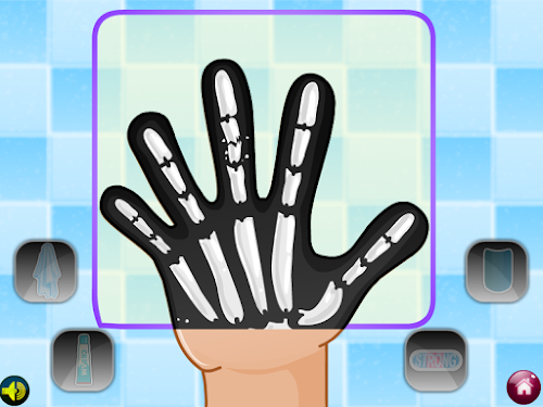 Today you are a doctor for a day, and that being a good doctor and get need to know what to do and how to use the tools that we have in hand equipment to cure the patient. Today the emergency room at the hospital, the patient presented complaining of severe pain in the hand. This patient fell and seriously injured, and you must help him to avoid suffering quickly. The fall injured his hand when he fell hand in bottles, screws, nails. You have to hand clean water disinfectant to remove patient hand towel to clean blood nails, apply antiseptic cream, dab the wound with disinfectant and surgical thread to sew the wound that is open. Also because of the fall patient hand was swollen badly and can not remove the ring on their finger, and you have to apply the cream in the ring and to help the patient to remove his ring. You have to hand clean of bacteria, microbes, viruses and germs with disinfectant. After you have ensured that the hand is clean and disinfected, will be going to the patient makes an X-ray Scan. We notice that our patient has fractured a finger and apply a durable patch that will speed healing of the finger. Success in this doctor job.