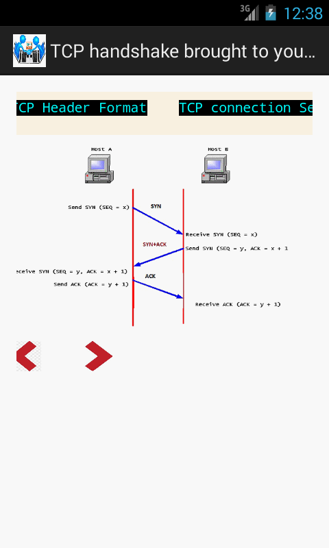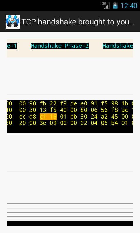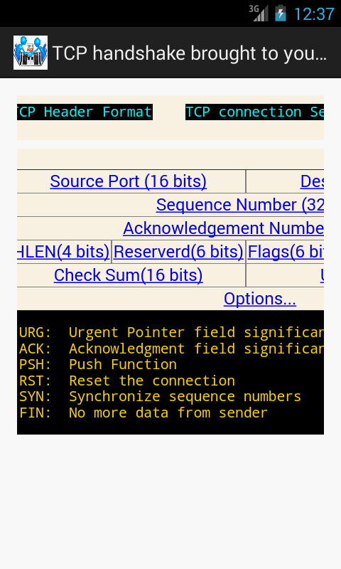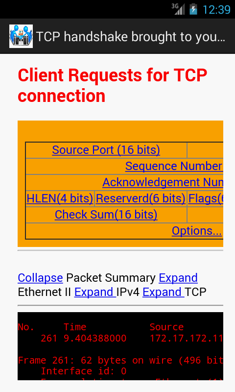 This app not only helps one inderstand the connection set up by animation but also visualizes what happens underneath by observing the 3 packet formats. One can study the TCP packet as well as the Network and Link layer ones that carry it.