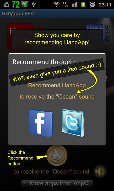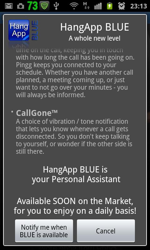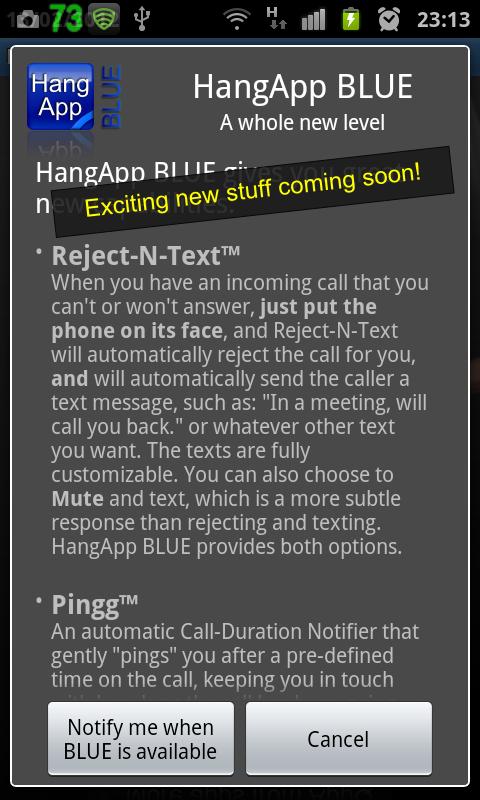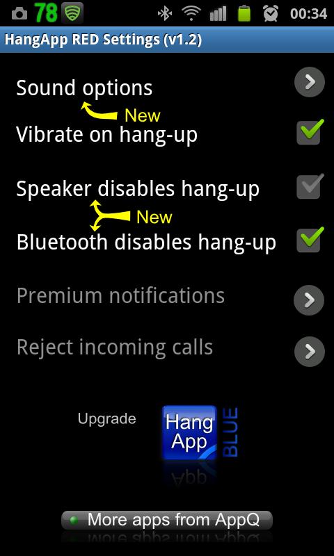 - Check out the Settings screen (use the phone's menu button to reach it) - it allows you to customize HangApp sounds, as well as other app behavior (e.g. disable HangApp when using a Bluetooth earpiece)