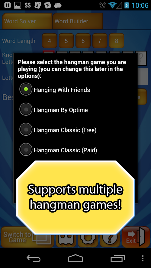 ★Supports "Hanging with Friends," "Hangman" by Optime Software, and "Hangman Classic."