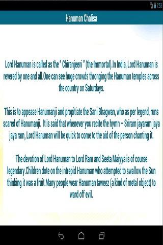 Hanuman Chalisa is the work of Hindi devotional poet Tulsidas. It appraises the Hindu lord Hanuman. Sticking to the devotional virtues, we have converted the entire poem in the form of an awe inspiring android application, and made it available in two languages: Hindi and English. This rhythmic poem has forty verses that are usually praised on Tuesdays as a part of rituals. The interface of this application is so fast and simple. It will lead you to a world of ultimate devotional fantasy. Please use this app and share your valuable feedback to promote this app more and more.