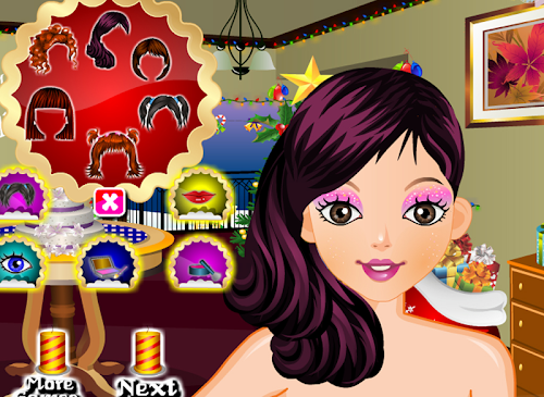 This free Christmas party makeover game let you play with a big variety of hairstyles, eye-shadow, blushers, color contacts, and lipsticks. After putting your make-up kit away its time to show her you know everything when it comes to stylish outfits. This year you can choose to wear different kind of outfits. Finish it off with some sparkling jewellery, earrings and necklaces. We wish everyone a Merry Christmas.
